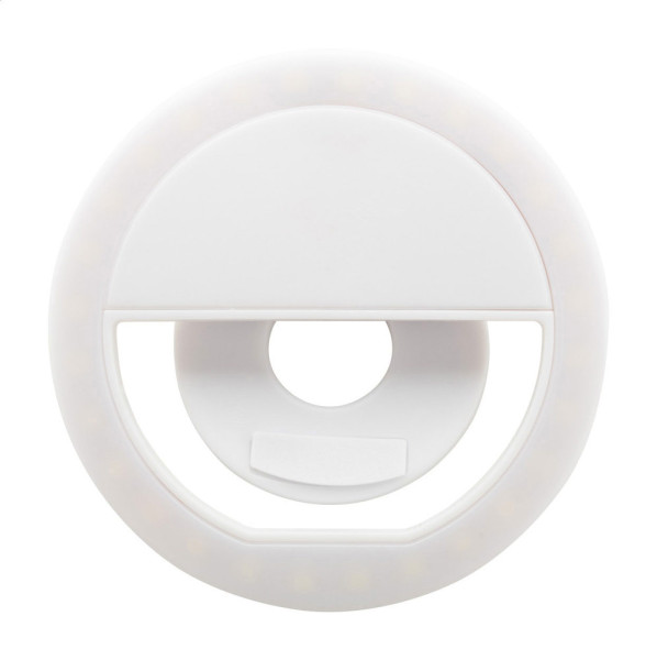 Selfie-Ringlicht aus Kunststoff mit 28 LEDs für Mobiltelefone. Mit 3 einstellbaren Helligkeitsstufen und eingebautem Akku. Inklusive USB-Ladekabel.