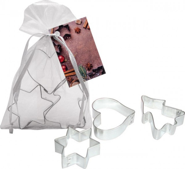 Im hübschen Organzasäckchen befinden sich drei Backförmchen für Ihre Weihnachtsbäckerei. Die langlebigen und immer wiederverwendbaren Ausstechformen aus Weißblech, Made in Germany, sind ein sympathisches und nützliches Giveaway für Ihre Kunden. Ihr Werbeeindruck oder eine individuelle Gestaltung der Karte ist ab 250 Stück möglich.