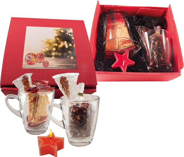 So können Ihre Kunden eine besondere weihnachtliche Teestunde zu zweit genießen. Unser Set Tea For Two beinhaltet zwei Glastassen, zwei Kandisstangen, geschmackvollen Weihnachts-Früchtetee, leckere Butterspekulatius-Kekse sowie ein hübsches Sternlicht. Das Etikett im Standardmotiv kann mit Ihrem Logo versehen oder, ebenfalls ab 100 Stück, individuell gestaltet werden.