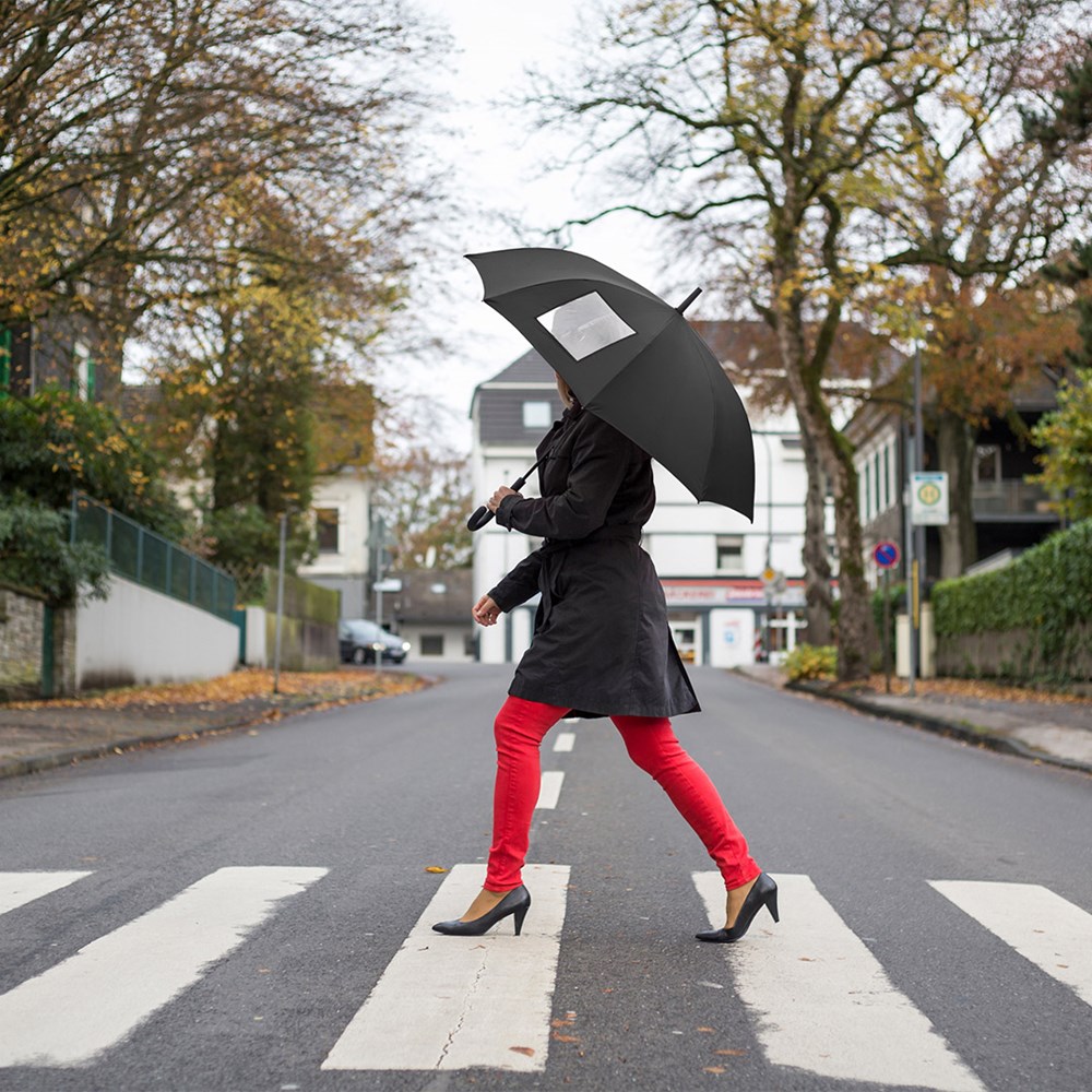 Besonderer Automatik-Stockschirm mit transparentem Sichtfenster Komfortable Automatik-Funktion zum schnellen Öffnen, hochwertiges Windproof-PLUS-System für eine maximale Gestell-Flexibilität bei stärkeren Windböen, flexible Fiberglasschienen, stabiler Stahlstock, Soft-Touch-Griff und -Top, Griff mit integrierter Auslösetaste und Werbeanbringungsmöglichkeit, höherer Korrosionsschutz durch schwarze Galvanisierung des Stahlstocks, transparentes Sichtfenster in einem Segment