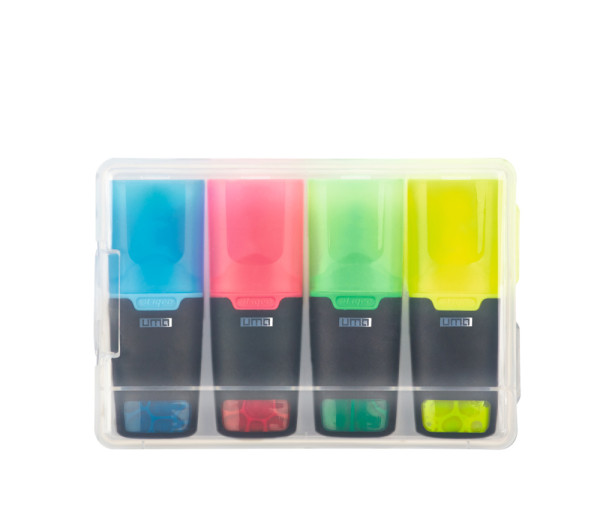 Flüssig-Textmarkerset bestehend aus 4 LIQEO HIGHLIGHTER MINI in einer klar transparenten Kunststoffverpackung. Standardfarben der Textmarker in gelb, grün, magenta und blau. Optional wählbare Textmarkerfarben: orange und violett.