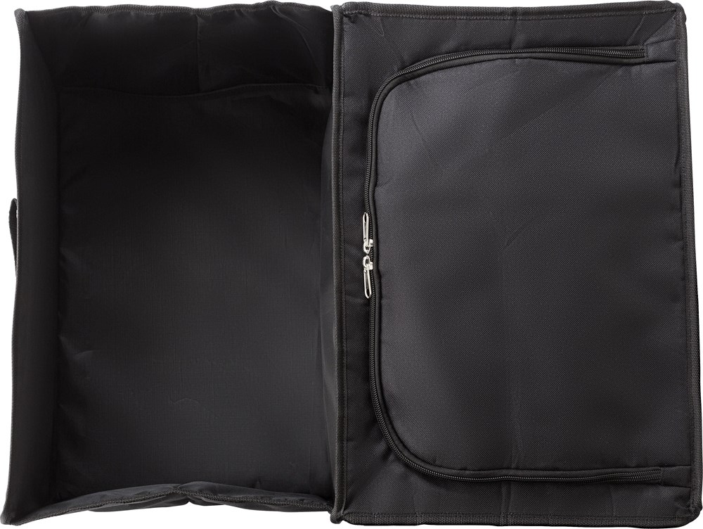 Autotasche aus Polyester (600D). Zwei Fächer, eine Kühltasche mit Reißverschluss geschlossen. Aluminium innen auf der Seite der Kühltasche. Zusammenklappbar.