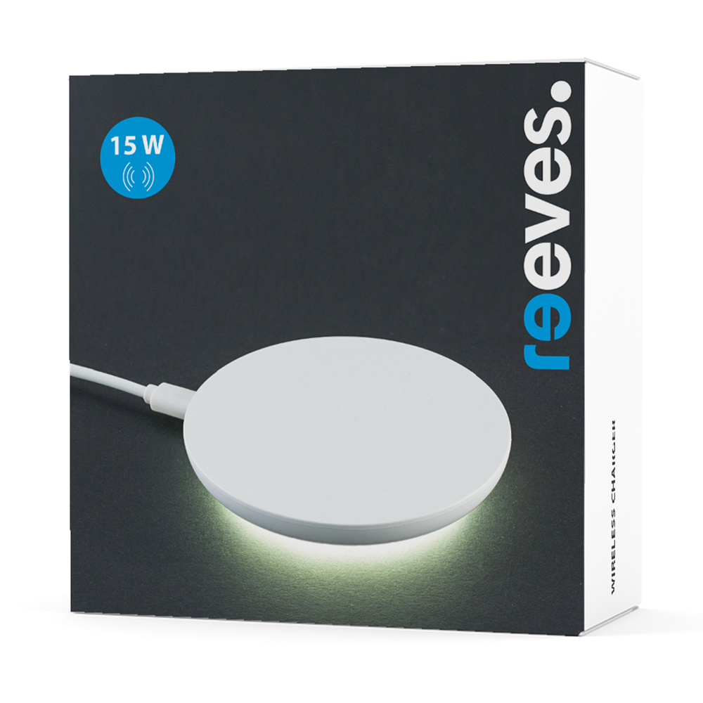 Der Wireless Charger hat eine Ausgangsleistung bis zu 15 Watt (Fast Charge), je nach Kompatibilität des zu ladenden Endgerätes. Ist das Gerät an eine Stromquelle angeschlossen, leuchtet ein weißer Lichtring auf der Unterseite des Chargers. Der Charger ist so designed, dass das Licht den Eindruck eines über ihm schwebenden Gerätes erweckt. Während des Ladevorgangs pulsiert der Lichtring weiß.