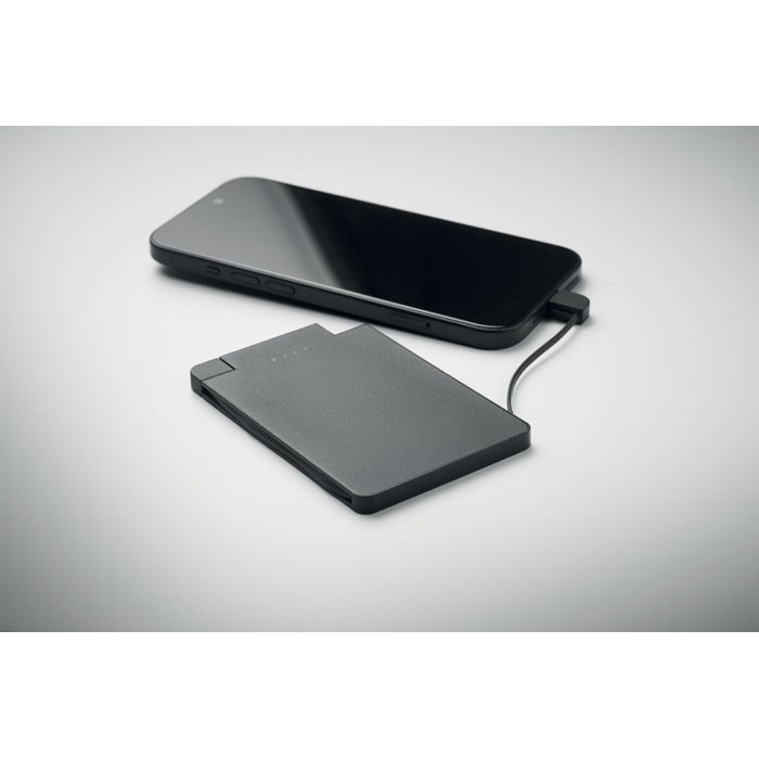 Magnetische, kreditkartengroße Powerbank 2500 mAh aus ABS mit integrierten Kabeln. Die Powerbank haftet an magnetischen iOs-Smartphones. Eingang: Typ-C und Ausgang Typ-C, kompatibel mit IOS-Geräten.