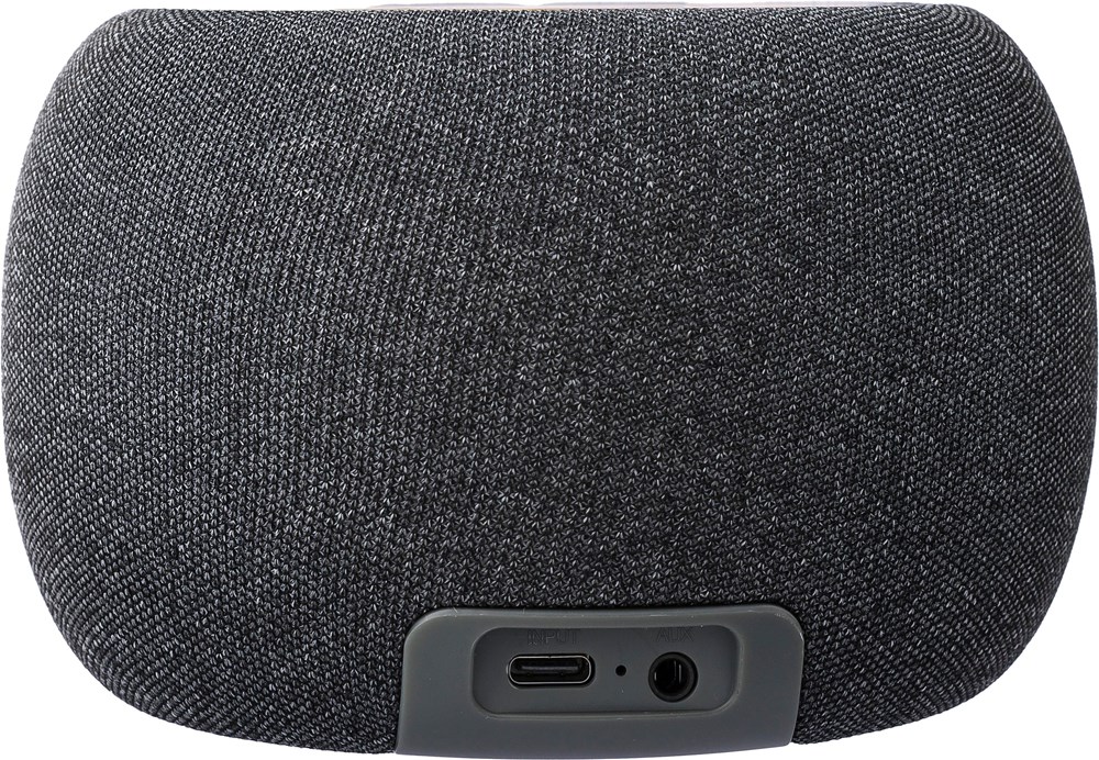 Lautsprecher aus Bambus und recyceltem ABS mit Stoffdetails um den Lautsprecher. 5W Ausgang, DC 5V Eingang, 1200mAh eingebauter Akku, mit 6 Stunden Spielzeit. Arbeitsabstand von 15-20 Metern, Signal-Rausch-Verhältnis von 87 dB. Frequenzbereich: 100 Hz bis 20 kHz. Inklusive 50 cm Typ-C-Ladekabel, kabelloses laden mit 5W. Drahtlose Verbindungstechnologie: 5.2. Einzeln verpackt in einer braunen Pappschachtel.