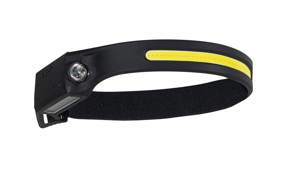 Kopflampe mit Stirn- und Punktleuchte und Sensorbedienung.