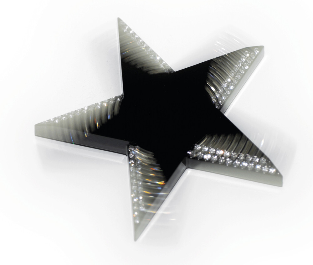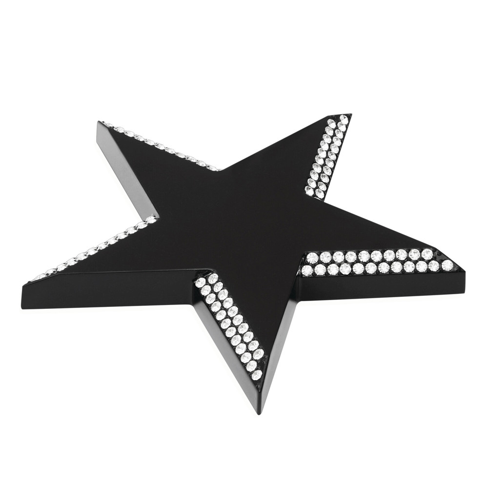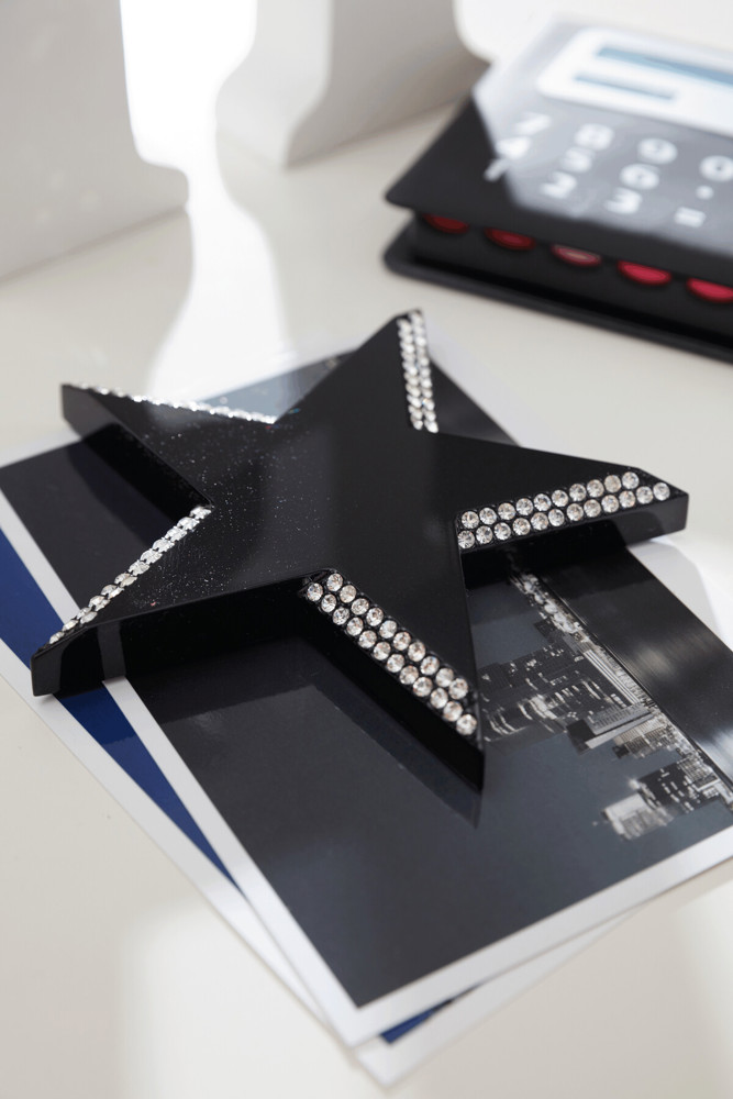 Briefbeschwerer TRONDHEIM, drehbar: aus schwarzem, schweren Metall zum Beschweren von Briefen oder Unterlagen, Sternspitzen mit funkelnden Strasssteinen verziert