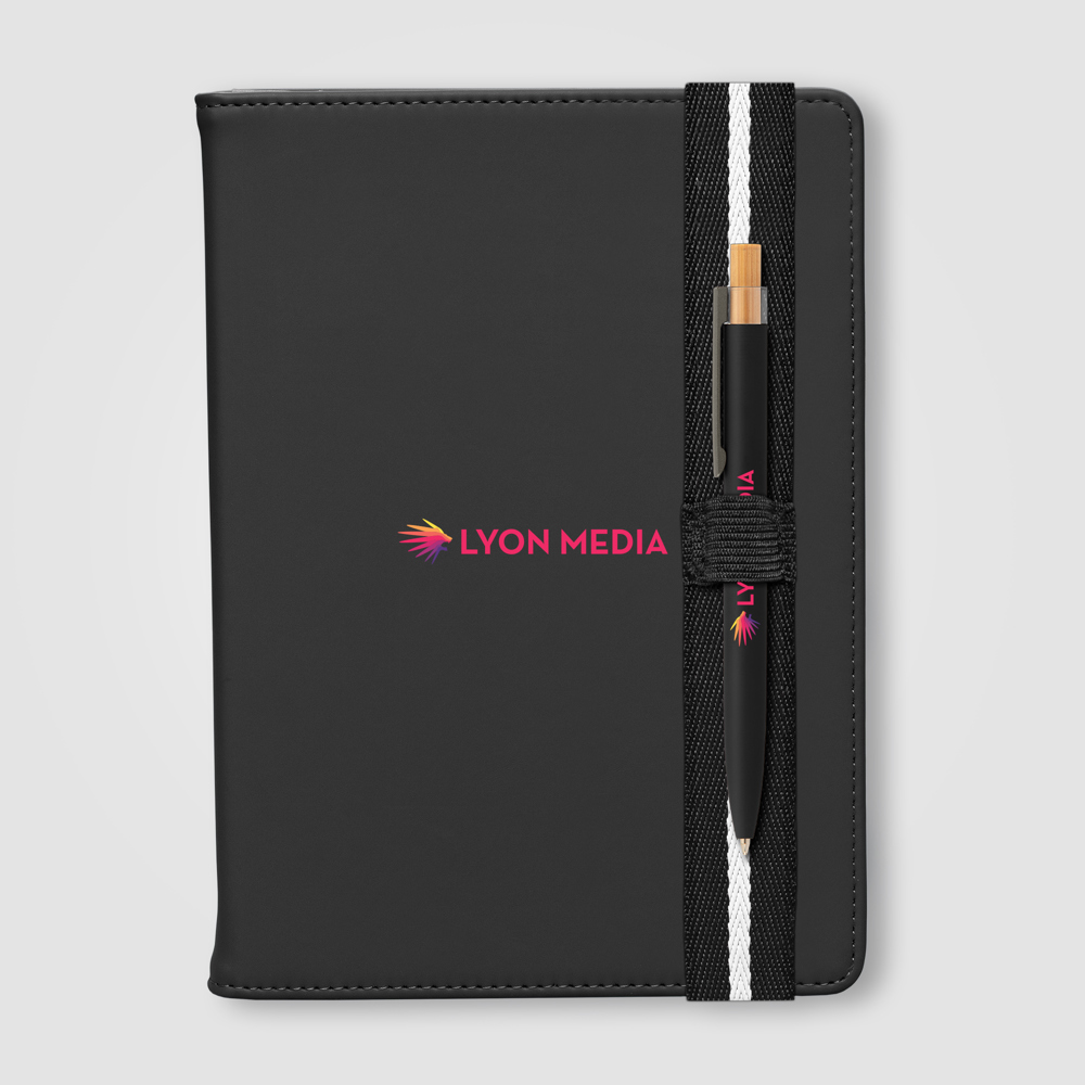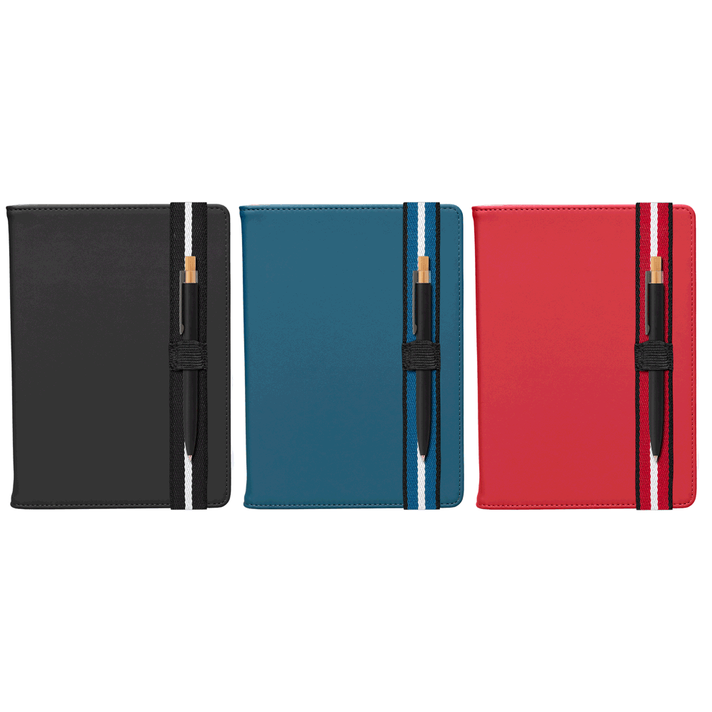 **Demnächst verfügbar – Ende März** Dieses nachfüllbare Newport Notizbuch- und Kugelschreiber-Set stellt ein komplettes, elegantes Set zum Notieren dar. Der Einband des Notizbuchs besteht aus PU (Polyurethan) mit einem Anteil von mindestens 50 % recycelten Post-Consumer-Materialien und ist mit einem hochwertigen Innenfutter versehen. Sein unverwechselbares Aussehen verdankt es dem Chevron-Gewebe, das auf den elastischen Verschluss aufgenäht ist und das Notizbuch sicher verschlossen hält. Die Funktionalität wird durch eine nachfüllbare Innenstruktur, eine Dokumententasche im Inneren und eine praktischerweise in der Mitte platzierte Kugelschreiberhalterung maximiert. Das Set wird durch einen schwarzen MTR Kugelschreiber ergänzt und enthält ein A5-Notizbuch mit 80 Blatt 70 g/m² FSC®-zertifiziertem liniertem Papier, sodass Sie alles, was Sie benötigen, in einer stilvollen, bewussten Kollektion vereint haben.