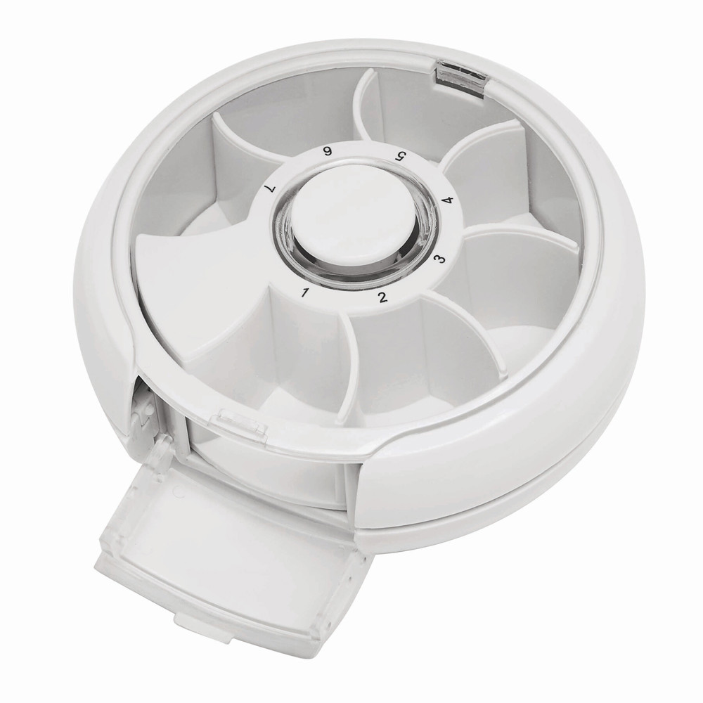 Tablettendose DAY BY DAY: mit 7 Fächern, die auf Knopfdruck fächerweise rotieren - seitliches Fenster zum Aufklappen und Herausnehmen der Tabletten